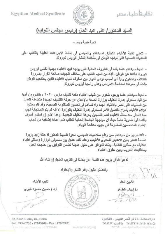 وجاء نص الخطاب كالتالي: "المهندس مصطفى مدبولى رئيس مجلس الوزراء، تتمنى نقابة الأطباء التوفيق لسيادتكم وللحكومة في إتخاذ الإجراءات الكفيلة بالتغلب على التحديات الصحية التي تواجه الوطن في مكافحة إنتشار فيروس كورونا، نحيط سيادتكم علما بأنه في الظروف الحالية التي يواجه فيها الأطباء بجدية تفشى فيروس کورونا دفاعا عن الوطن، فإنه من المهم التأكيد على مختلف الجهات صانعة القرار بضرورة التكاتف والتعاون ونبذ أي أسباب تؤدي للتوتر بين صفوف شباب الأطباء الذين يحتاجهم الوطن بشدة في معركته لمكافحة الأمراض وعلى رأسها فيروس كورونا".