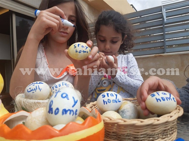 أطباق عديدة أختلفت اشكالها ولكن الكمامة واحدة، فقد استهلت العائلات يومها بتلوين البيض مع صغارها، وهناك من اكتفى بالكلمة المشهور حاليًا "stay home".