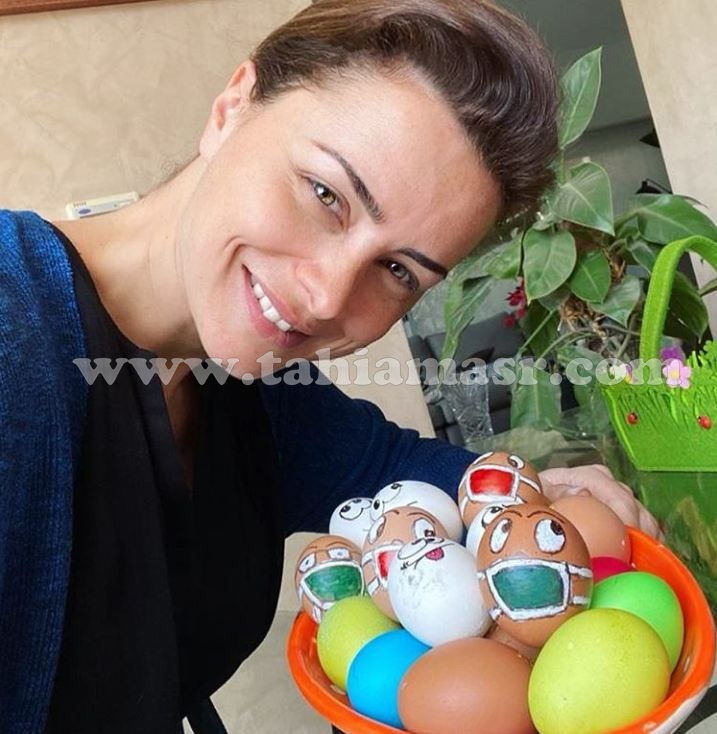 فيما شاركت الفنانة اللبنانية نور أطفالها تلوين البيض، الذي ارتدى الكمامات في عصر الكورونا.