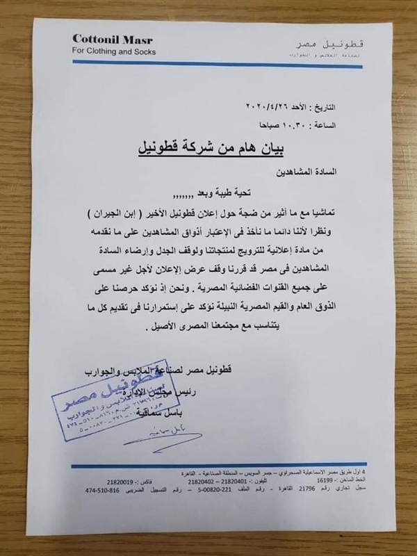 وقال باسل سماقية رئيس مجلس إدارة قطونيل في تصريحات له اليوم، إن المجموعة قررت وقف عرض الإعلان على الشاشات المصرية بدءا من اليوم، بعد تلقيه ردود الفعل حول الإعلان وجرى مناقشتها في اجتماع مجلس إدارة المجموعة والتي قررت وقف الإعلان.