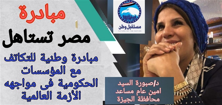 أطلقت الدكتورة صبورة السيد الامين العام المساعد لحزب مستقبل وطن أمانة محافظة الجيزة الدعوة لرجال الاعمال فى محافظة الجيزة للمشاركة فى مبادرة شعبية لحشد جهود دعم الحكومة في مواجهة فيروس كورونا (كوفيد-19).