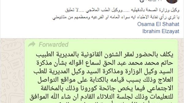 إحالة طبيب إلى التحقيق بسبب نشره "تدوينه" على فيس بوك عن فيروس كورونا