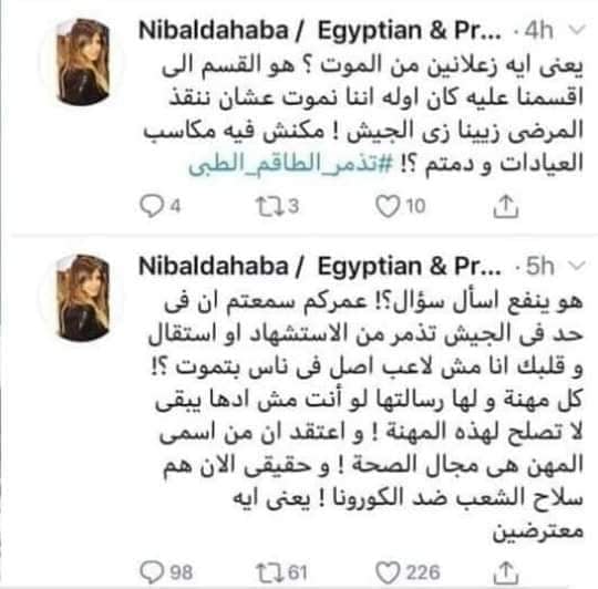 وتابعت "نيبال" مدير شركة سانوفي: عمركم سمعتم ان فيه حد من الجيش تذمر من الاستشهاد؟ أو استقال وقالك أنا مش لاعب أصل فيه ناس بتموت؟ كل مهنة ولها رسالتها لو انت مش قدها يبقى أنت لا تصلح لهذه المهنة، وأعتقد أن من اسمى المهن هي مجال الصحة، يعني ايه معترضين!!".