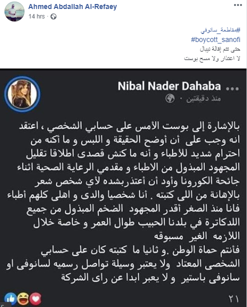 ودشن الأطباء عبر صفحاتهم على موقع التواصل الاجتماعي "فيس بوك" هاشتاج #مقاطعة_سانوفي و#إقالة_نيبال بعد نشر الأخيرة وهي مديرة شركة الدواء المعروفة، هجوما ضد الاطباء على صفحتها الشخصية، قائلة: يعني ايه زعلانين من الموت؟ هو القسم اللي اقسمنا عليه كانأوله اننا نموت علشان ننقذ المرضى زيينا زي الجيش .. مكنش فيه مكاسب العيادات ودمتم؟! .