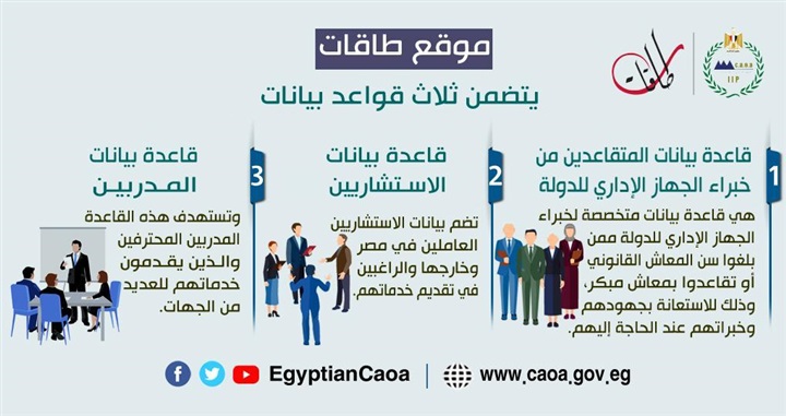 وأوضح رئيس الجهاز أن "طاقات" تتضمن بداخلها 3 قواعد، الأولى هي قاعدة المتقاعدين من خبراء الجهاز الإداري للدولة، وهي مخصصة لخبراء الجهاز الإداري للدولة ممن بلغوا سن المعاش القانوني أو تقاعدوا بمعاش مبكر، وذلك للاستعانة بجهودهم وخبراتهم عند الحاجة إليهم في أعمال استشارية أو تدريبية لوحدات الجهاز الإداري للدولة، والقاعدة الثانية هي قاعدة بيانات الاستشاريين المعنية بضم بيانات الاستشاريين العاملين في مصر وخارجها والراغبين في تقديم خدماتهم للوحدات الحكومية على المستويين القومي والمحلي، بينما تختص القاعدة الثالثة ببيانات المدربين، وتستهدف هذه القاعدة المدربين المحترفين والذين يقدمون خدماتهم لجهات حكومية، كما ستتاح للراغبين في الاستفادة منها بالقطاع الخاص.