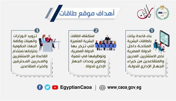 وقال الدكتور صالح الشيخ: تهدف "طاقات" أيضا إلى بناء قاعدة بيانات بالطاقات البشرية المتاحة داخل الدولة المصرية تخص الاستشاريين، والمدربين، والمتقاعدين من خبراء الجهاز الإداري للدولة، وذلك بهدف استكشاف الطاقات البشرية المتميزة التي تزخر بها الدولة المصرية.. مشيرا إلى أن "طاقات" ستقوم أيضا بتزويد الوزارات والهيئات وكافة الجهات الحكومية باحتياجاتها من الاستشاريين والمدربين المحترفين والخبراء المتقاعدين.