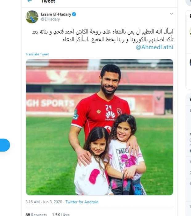 غرد عصام الحضري حارس منتخب مصر السابق، بصورة لأحمد فتحي مع بناته معلقا عليها: "أسأل الله العظيم أن يمن بالشفاء على زوجة الكابتن أحمد فتحي وبناته بعد تأكد إصابتهم بكورونا وربنا يحفظ الجميع، أسألكم الدعاء".