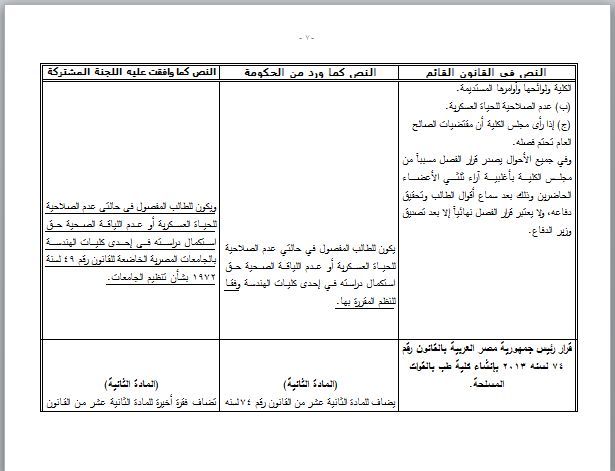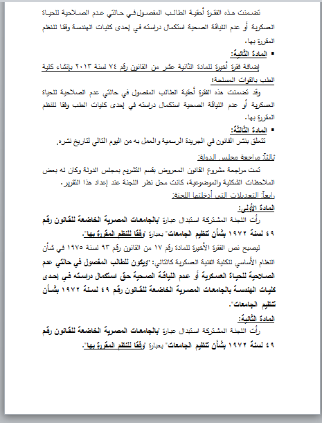 وقد تضمنت هذه الفقرة أحقية الطالب المفصول في حالتي عدم الصلاحية للحياة العسكرية أو عدم اللياقة الصحية استكمال دراسته في إحدى كليات الطب وفقا للنظم المقررة بها.