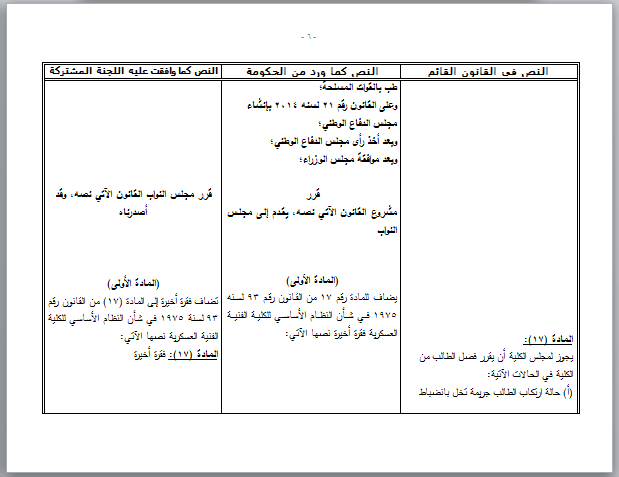 إضافة فقرة أخيرة للمادة رقم 17 من القانون رقم 93 لسنة 1975 في شأن النظام الأساسي للكلية الفنية العسكرية: