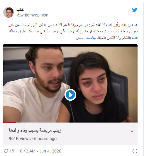 أعرب العديد من النشطاء، عن إستيائهم من طريقة أحمد حسن والمبايعة بزوجته ووالدها الذي توفي لتحقيق أكبر عدد من المشاهدات، قائلين: " يحرق ابو الجوع و الجري ورا الفلوس اللي يخلي واحد يطلع مراته و هي منهارة علي موت ابوها لدرجة ان حصلها اجهاض و بيتكلم علي تفاصيل مظنش ان في راجل طبيعي ممكن يتكلم عنها قدام الناس كده عادي".