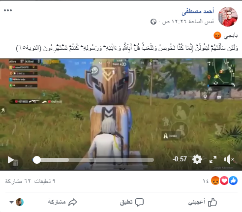 أعرب أحد رواد موقع التواصل الإجتماعي "فيس بوك"، عن غضبه من تلك التحديثات الجديدة في لعبة ببجي، قائلًا: "من فترة لاحظت ان أي لاعب ممكن يرحب بلاعب معاه من خلال أنه يسجد له على الأرض.. وحقيقي بقيت افكر أن دي مجرد لعبة بس هو بيسجد فعلًا فهو أثم في حق الله".