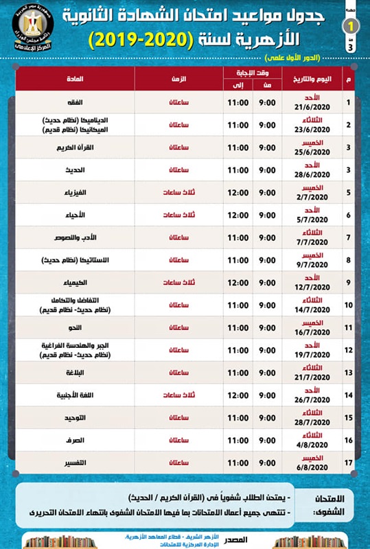 أما بشأن امتحانات الشهادة الثانوية الأزهرية، فقد جاء في الإنفوجراف، أن امتحانات الدور الأول للقسم العلمي، سوف تبدأ اعتباراً من يوم الأحد الموافق 21 يونيو 2020، وتستمر حتى يوم الخميس 6 أغسطس 2020، على أن يبدأ الامتحان الساعة التاسعة صباحاً، كما سيتم إجراء الامتحان الشفوي للطلاب في (القرآن الكريم – الحديث)، وستنتهي جميع أعمال الامتحانات بما فيها الامتحان الشفوي بانتهاء الامتحان التحريري.