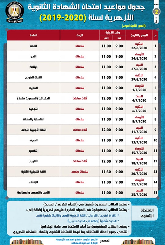 أما بشأن جدول امتحانات الدور الأول للقسم الأدبي، رصد الإنفوجراف، أنها ستبدأ اعتباراً من يوم الإثنين الموافق 22 يونيو 2020، وتستمر حتى يوم السبت 25 يوليو 2020، على أن يبدأ الامتحان الساعة التاسعة صباحاً، كما سيتم إجراء الامتحان الشفوي للطلاب المبصرون في (القرآن الكريم – الحديث)، وكذلك إجراء امتحان شفوياً فقط للطلاب المكفوفون في المواد المقررة عليهم تحريرياً، إضافة إلى (القرآن الكريم – القراءات – اللغة الأجنبية الأولى والثانية)، فضلاً عن امتحانهم في الحديث شفوياً، وتحريرياً، بالإضافة إلى إعفاء الطلاب المكفوفون من أداء الامتحان في مادة الجغرافيا، مع الانتهاء من جميع أعمال الامتحانات بما فيها الامتحان الشفوي بانتهاء الامتحان التحريري.