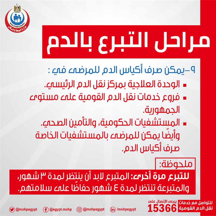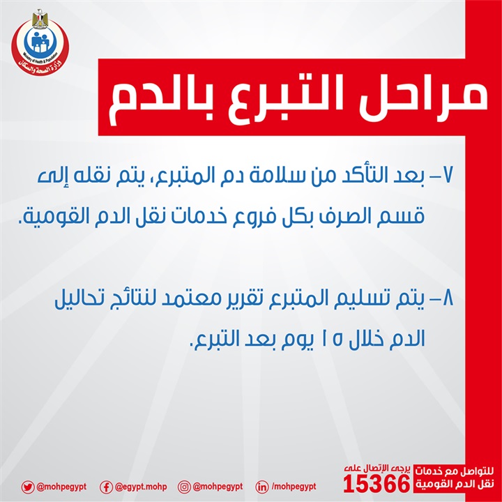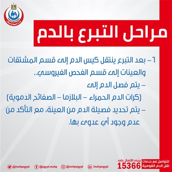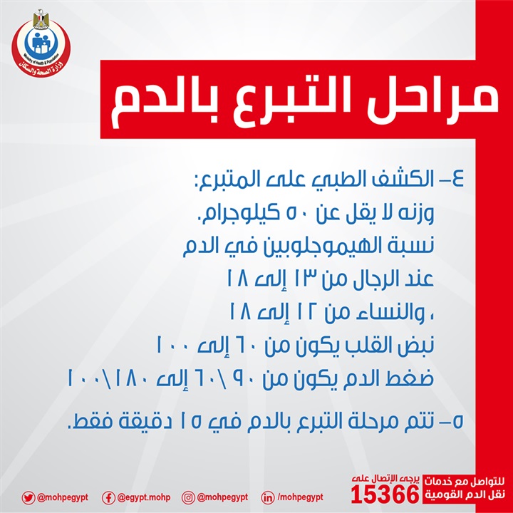 نشرت وزارة الصحة والسكان عبر صفحتها الرسمية على موقع التواصل الاجتماعي فيس بوك، تعليمات مهمة بمراحل التبرع بالدم، منها ملء استبيان لتأكيد رغبته في التبرع بالدم، والتأكد من أن المتبرع تنطبق عليه شروط التبرع.