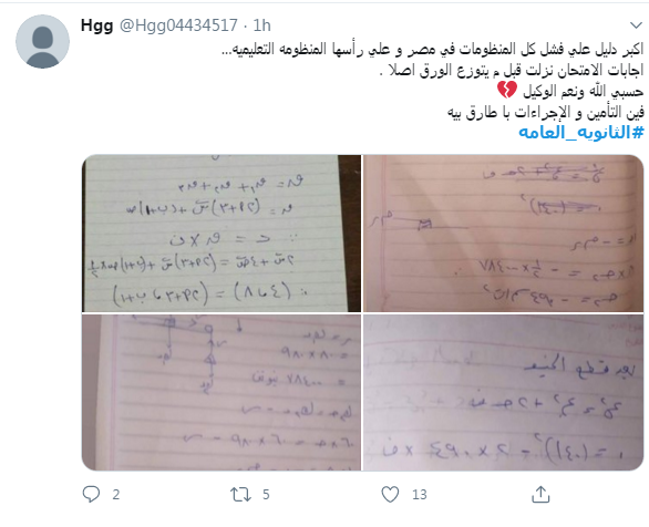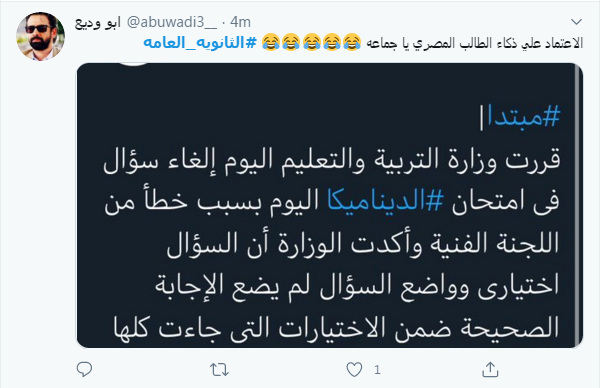 غردت إحدى نشطاء "تويتر"، قائلة: "امتحان الديناميكا اتسرب ومحلول على جروبات التليجرام والواتس ماينفعش التهريج ده المفروض ان الطلاب مايدخلوش اللجنة بالموبايل اصلا كل رؤوساء اللجان دول لازم يتحاسبوا والـ 15 الف طالب اللي في الجروبات دي لازم يتعاقبوا تحرموا من دخول لمدة سنتين علشان يعرفوا ان الله حق".