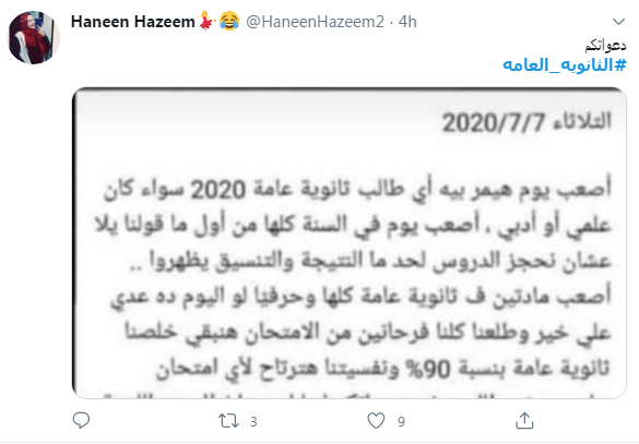 غردت إحدى طلاب الثانوية العامة على "تويتر"، قائلة: "أصعب يوم هيمر بيه أي طالب ثانوية عامة 2020 سواء علمي أو أدبي..أصعب يوم في السنة كلها من اول ما قولنا يلا نحجز الدروس لحد ما النتيجة والتنسيق يظهروا..أصعب مادتين في الثانوية العامة كلها وحرفيًا لو اليوم ده عدى على خير وطلعنا كلنا فرحانين من الامتحان هنبقى خلصنا ثانوية عامة بنسبة 90%".