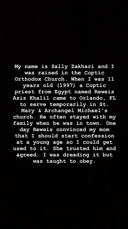 رَوَت سالي بشكلِ تفصيليلا عن ما حدث لها على يد الكاهن: أنا اسمي سالي زخاري وأنا اتربيت في الكنيسة القبطية الأرثوذكسية، لما كان عندي 11 سنة 1997، كاهن قبطي من مصر يدعى (رويس.ع.خ) جه أورلاندو في فلوريدا، عشان يخدم مؤقتا في كنيسة العذراء مريم ورئيس الملائكة ميخائيل ... كان بيبات كتير عندنا في البيت لما كان بيبقى في المدينة، وفي يوم أقنع والدتي إني المفروض أبدأ الاعتراف في سني الصغير ده عشان أتعود عليه، هي وثقت فيه ووافقت، كنت خايفة شوية بس أنا اتعلمت أطيع.