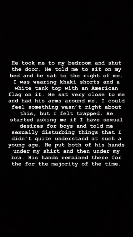 أضافت "سالي" في اعترافاتها، أن الكاهن "رويس" أخذها إلى غرفته وأغلق الباب وطلب منها أن تستريح على السرير، وجلس هو بجوارها.. "كنت لابسة شورت كاكي وtank top بيضا عليها علم أمريكا، وقعد قريب جداً مني وحط دراعاته حواليا وكنت حاسة إن فيه حاجة غلط بس كنت حاسة إني محبوسة.. وبدأ يسألني لو عندي رغبات جنسية ناحية الولاد، وبدأ يقوللي حاجات جنسية مزعجة ماكنتش فاهماها في السن ده، بعدين حط إيديه الاتنين تحت البلوزة وبعدين تحت حمالة الصدر، وايديه فضلت كدة لأغلب الوقت".