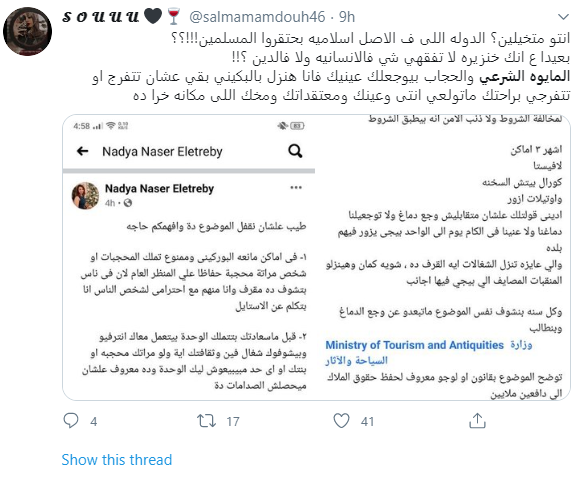 وتابع: "حضرتك هنا عايشه في دولة عالم تالت وكمان دولة إسلامية وبتنادي بأن الست عشان تبقى حرة "لازم تقلع"!..معلش حبيبتي أحب أطمنك المايوه الشرعي بيتنزل بيه عادي في أوروبا".