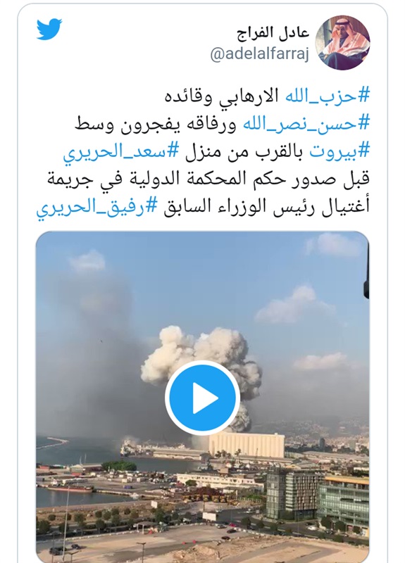 وبناء على الفرضية السابقة، اتهم مغردون حزب الله اللبناني بتدبير الانفجار قبيل صدور حكم المحكمة الدولية في جريمة اغتيال رئيس الوزراء الأسبق رفيق الحريري.