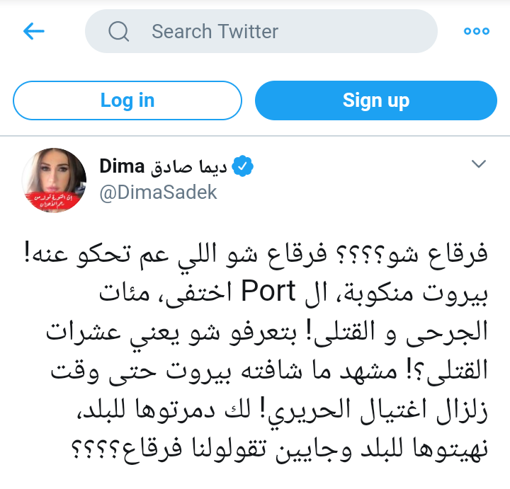 وفي نفس السياق، قالت الإعلامية ديما صادق: "فرقاع شو اللي عم تحكو عنه؟! بيروت منكوبة، والـ Port اختفى، مئات الجرحى و القتلى، بتعرفوا شو يعني عشرات القتلى؟! مشهد ما شافته بيروت حتى وقت زلزال اغتيال الحريري، لكْ دمرتوها للبلد، أنهيتوها للبلد، وجايين تقولولنا فرقاع؟!"
