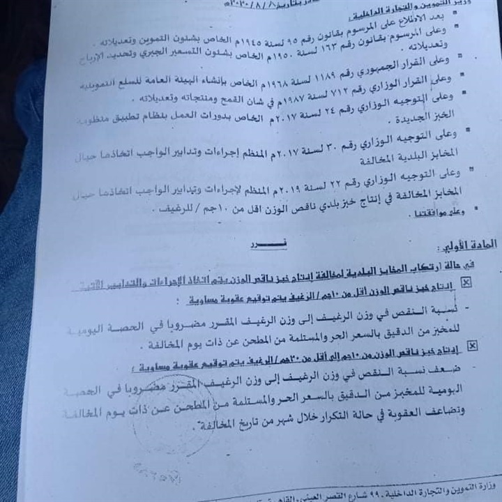 وأصدر الدكتور علي مصيلحي وزير التموين والتجاره الداخلية، أمس، قرارا بشأن تحديد تكلفة إنتاج شوال الدقيق المدعم إضافة إلي وزن الرغيف البلدي المدعم، وحدد سعر تكلفة إنتاج شوال الدقيق المدعم بـ 265 جنيها للمخابز المستخدمة السولار في عملية الإنتاج بينما تم تحديد التكلفة بنحو 283 جنيها للمخابز المستخدمة الغاز الطبيعي في عملية إنتاج الخبز المدعم.