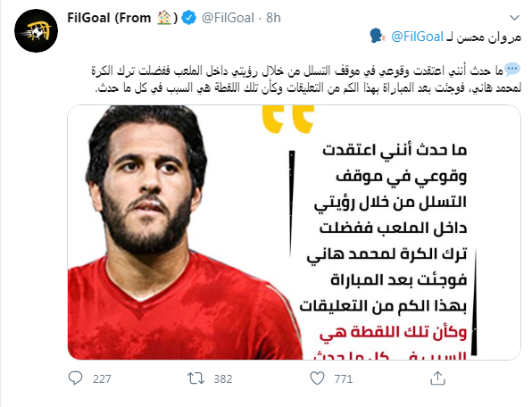 وبالنظر لموقف مروان محسن فإنه قد وقع بين فكي الأسد فهناك عذرين أقبح من ذنبه، من تمريرة بادجى، يتضح أن هناك احتمالين، الاحتمال الأول أن يكون مروان محسن فاقد تركيزه ولم يدرك موقعه داخل المستطيل الأخضر.