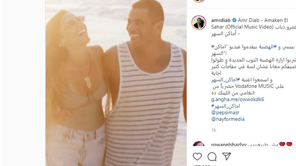 شارك النجم عمرو دياب عبر حسابه الشخصى على إنستجرام بأغنيته الجديدة "أماكن السهر" وهى فيديو كليب يجمعه بأصدقاؤه وزوجته الفنانة دينا الشربينى وهما يستمتعان بقضاء عطلتهم الصيفية على البحر ويظهران فى لوك صيفى جميل وبسيط وهو يتغازل فيها فى جو من المرح والسعادة، وحازت الأغنية على إعجاب كل جمهوره ومتابعينه معلقين له "حاجة فوق العظمة".
