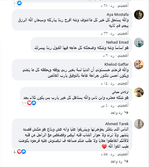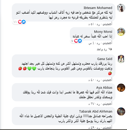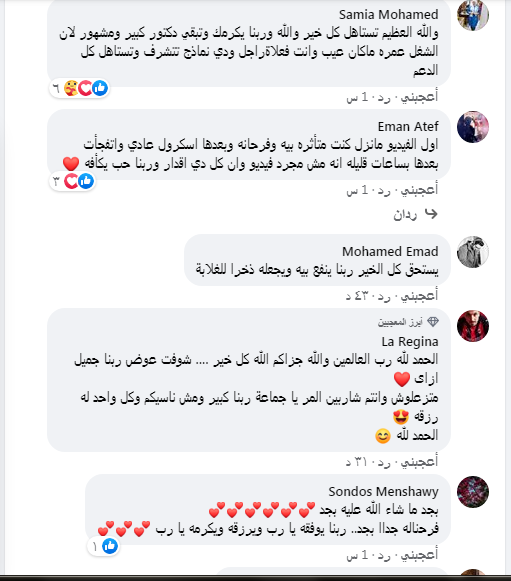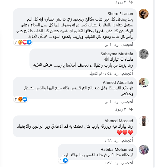 وأوضحت التعليقات حالة الحب التي ظهرت تجاه " بائع الفريسكا" المكافح، ومنها :"ماشاء الله هو صادق ويستاهل كل الخير"، و "والله العظيم تستاهل كل خير والله وربنا يكرمك وتبقي دكتور كبير ومشهور لان الشغل عمره ماكان عيب وانت فعلًا راجل ودي نماذج تتشرف وتستاهل كل الدعم".