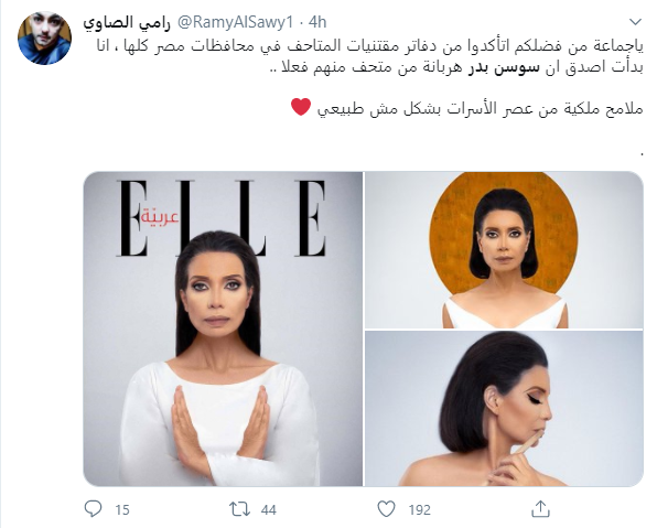 كتبت إحدى النشطاء على الصور، قائلة: "ياجماعة من فضلكم اتأكدوا من دفاتر مقتنيات المتاحف في محافظات مصر كلها، انا بدأت اصدق ان سوسن بدر هربانة من متحف منهم فعلا ..ملامح ملكية من عصر الأسرات بشكل مش طبيعي".