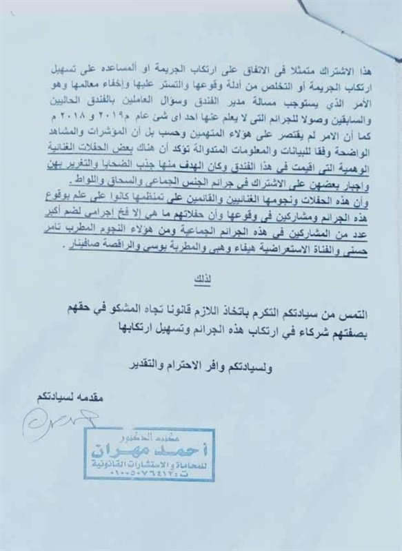 تقدم المحامي أحمد مهران ببلاغ للنائب العام المستشار حمادة الصاوي، ضد مدير فندق فيرمونت نايل سيتي، وعددا من نجوم الفن وهم، تامر حسني وهيفاء ورامي عياش وصافينار وبوسي، والمطربة أمينة، والمطرب الشعبي محمود الليثي. بتهمة الاشتراك في قضية الاغتصاب أو الشذوذ والجنس الجماعي والمعروفة إعلاميا بـ جريمة الفيرمونت.