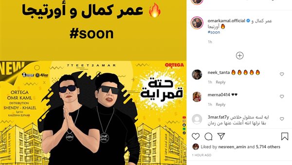 شارك المطرب الشعبى عمر كمال عبر حسابه الرسمى على موقع التواصل الإجتماعى "إنستجرام" ببوستر يكشف فيه عن عمل جديد يجمعه مع المطرب الشعبى "أورتيجا" في أغنية جديدة تحمل اسم "حتة قمراية" معلقًا عبر البوستر الرسمى للأغنية "عمر كمال وأورتيجا..قريبًا".