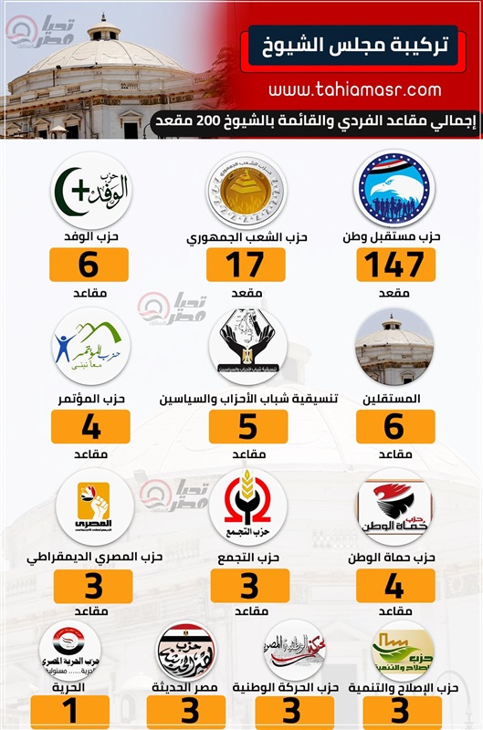 إقرأ أيضا تحيا مصر يرصد التركيبة السياسية لمجلس الشيوخ..مستقبل وطن يحقق الأغلبية بـ147 مقعد