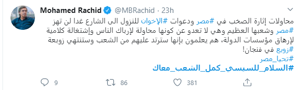 شارك المحلل السياسي محمد رشيد في الهاشتاج، قائلًا: "محاولات إثارة الصخب في مصر ودعوات الإخوان للنزول إلى الشارع لن تهز مصر وشعبها العظيم.. وهي لاتعدو عن كونها محاولة لإرباك الناس وإشتغالة كلامية لإرهاق مؤسسات الدولة، وهم يعلمون بإنها سترتد عليهم من الشعب وستنتهي الزوبعة".