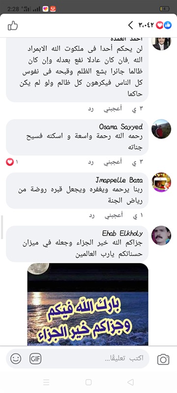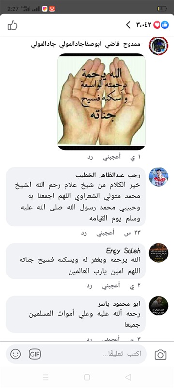 وقال تعليق اخر:"حبيبي ماشفتش زيه ابدا وافدنا كتير جدا ربنا يجعله في ميزان حسناته"، بينما قال اخر:"خير الكلام من شيخ علام رحم الله الشيخ محمد متولي الشعراوي اللهم اجمعنا به وحبيبي محمد رسول الله صلى الله عليه وسلم يوم القيامه".