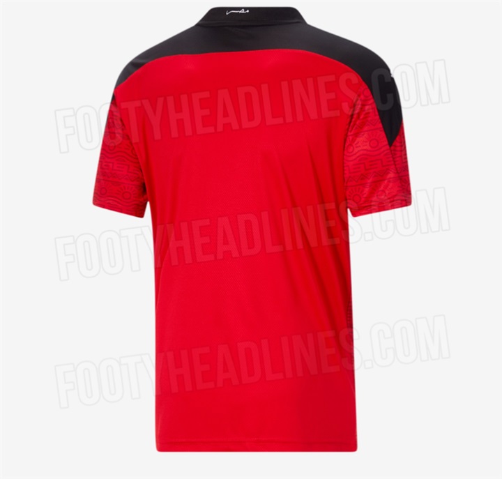 القميص من تصميم شركة بوما العالمية، والمتعاقدة مع الاتحاد المصري لكرة القدم، ويغلب على التصميم اللون الأحمر مع أجزاء من اللون الأسود أعلى القمبص، كما يميز التصميم استخدام رموز مستوحاه من الهيروغليفية المصرية.