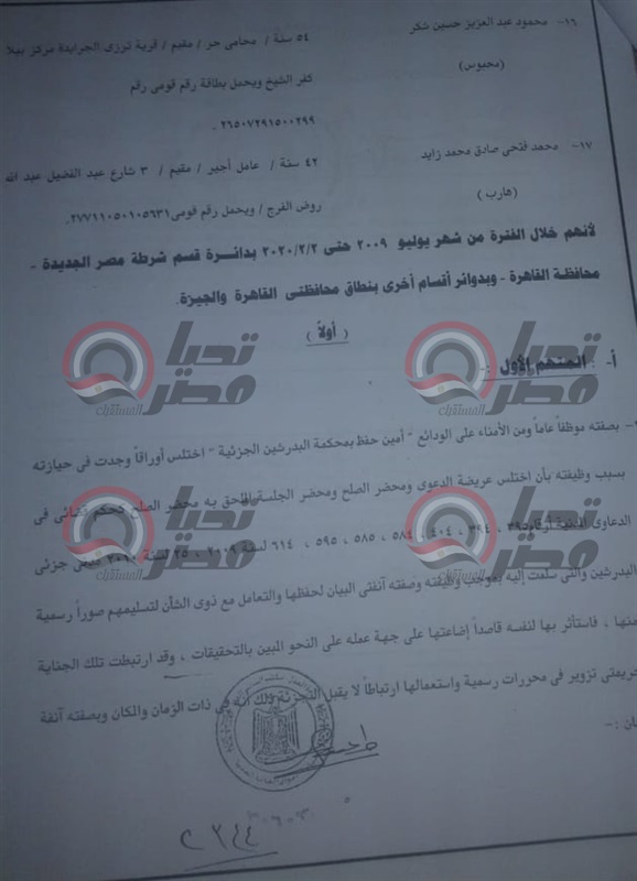 وأيضا اصطناع إخطارات بقيد الدعاوي موجهة إلى هيئة قضايا الدولة وهيئة الأوقاف المصرية للإيهام بصحة إجراءات اختصامها، وذيلوها بتوقيعات نسبوها زورا إلى كتاب أول المحكمة.