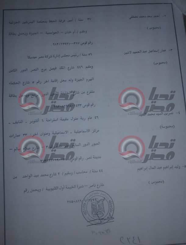 وأيضا، "نسرين السيد محمد – 46 سنة – سيدة أعمال، ووليد إبراهيم عبدالعال – 44 سنة – محاسب، وأحمد إسماعيل لاشين – 31 سنة – رجل أعمال، وفؤاد إسماعيل لاشين – 53 سنة – رجل أعمال وعضو مجلس إدارة شركة ميديكا، وإسماعيل إسماعيل لاشين – 48 سنة – رجل أعمال، وصلاح الدين مدني عبدالرحيم – 66 سنة – محامي".