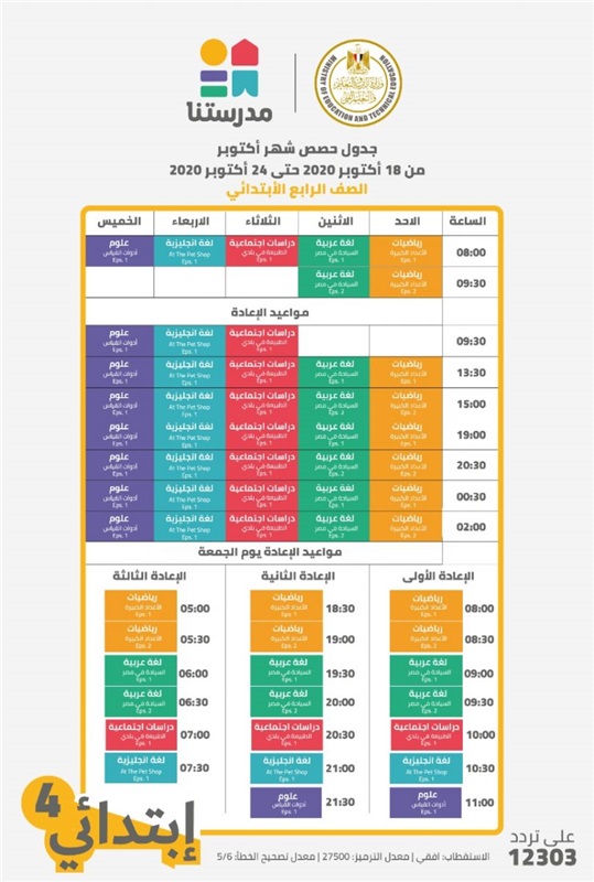 أعلنت وزارة التربية والتعليم والتعليم الفني، عن جداول عرض الحصص التعليمية بداية من الصف الرابع الابتدائى حتى الثالث الإعدادي على القناة التعليمية "مدرستنا".