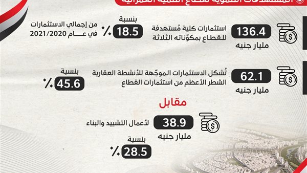 وأشارت السعيد إلى الاستثمارات الكُلية لخطة تنمية قطاع التنمية العمرانية حيث تبلغ الاستثمارات الكلية الـمُستهدفة للقطاع بمكوّناته الثلاثة نحو 136.4 مليار جنيه، بنسبة 18.5٪ من إجمالي الاستثمارات في عام 20/2021، حيث تُشكل الاستثمارات الـموجّهة للأنشطة العقارية الشطر الأعظم من استثمارات القطاع بنسبة 45.6٪ (62.1 مليار جنيه) مقابل 28.5٪ لأعمال التشييد والبناء (38.9 مليار جنيه)، و25.9٪ لمشروعات الـمياه والصرف الصحي (35.3 مليار جنيه).