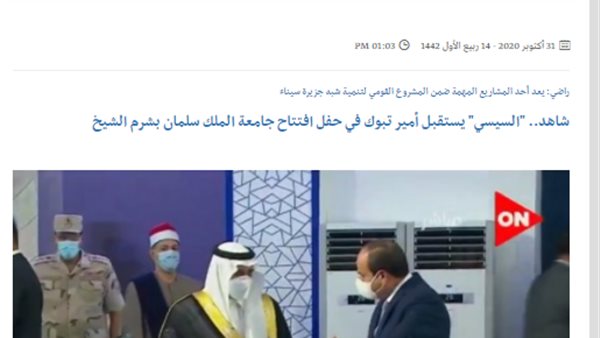 تناولت الصحف والمواقع الإخبارية السعودية، افتتاح الرئيس عبدالفتاح السيسي جامعة الملك سلمان بجنوب سيناء، صباح اليوم السبت، بحضور أمير منطقة تبوك الأمير فهد بن سلطان، حيث أشارت الصحف لحفاوة استقبال الرئيس عبدالفتاح السيسي بالأمير فهد بن سلطان بن عبدالعزيز أمير منطقة تبوك.