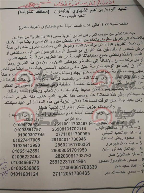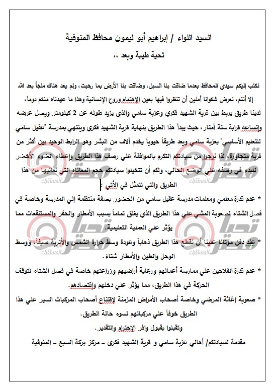 الأهالي ناشدوا مرشحي مجلس النواب، بالمحافظة أن يضعوا أيضا هذه الإشكالية علي أولوياتهم، حيث تضمنت شكواهم بأن الطريق يزيد طوله عن 2كيلومتر، ويصل عرضه وإتساعه قرابة 6أمتار، ويبدأ الطريق بنهاية قرية الشهيد فكري، وينتهي بمدرسة عقيل سامي للتعليم الأساسي بعزبة سامة، ويعد طريقًا حيويا يخدم ألاف من البشر، وهو الرابط الوحيد بين أكثر من قرية متجاورة.