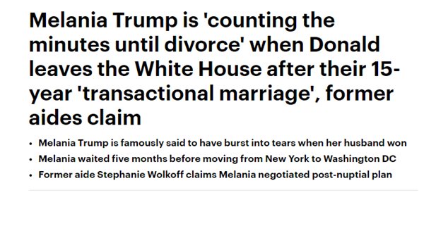 وكشفت مصادر مقربة من ميلانيا، أنها تريد صفقة ما بعد الطلاق، حيث تتفاوض لمنح ابنهما “بارون” حصة متساوية من ثروة ترامب، مُضيفة أن عائلة ترامب كانت لديهما غرف نوم منفصلة في البيت الأبيض، فهو مجرد "زواج تبادلي".
