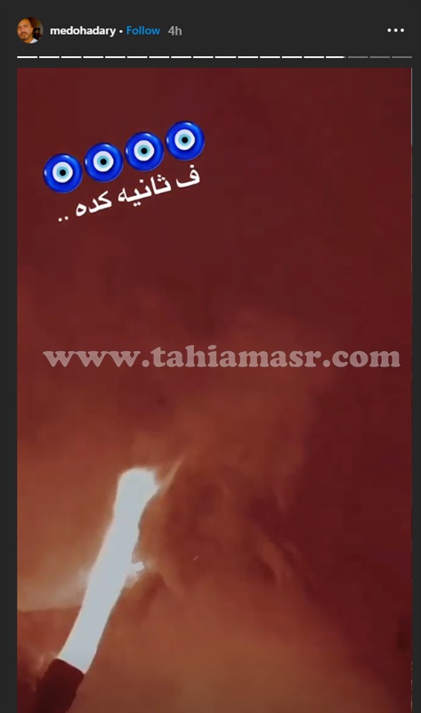 نشر ميدو الحضري العديد من الصور عبر حسابه الشخصي على موقع تبادل الصور والفيديوهات "إنستجرام" العديد من الحفل، وبعد دقائق شارك بفيديو الحريق، مُعلقًا عليه قائلًا: "في ثانية كدة"، وأرفق معها صور "خرزة زرقاء".