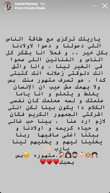 واستطرد حديثه قائلًا: "ياريتك تركزي مع طاقة الناس اللي دعولنا ودعوا لولادنا وفغلا انا بشكر كل الناس والفنانين اللس سعوا في الخير لينا.. متهورة بس بحبك".