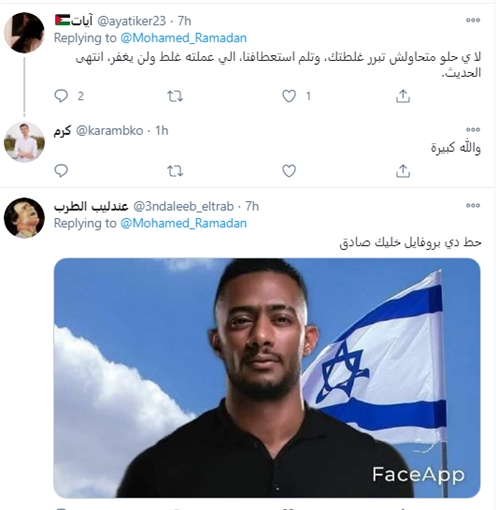 هاجم المتابعين محمد رمضان فور استبدال الصورة، واستنكر غالبيتهم نشر رمضان لصورة بالشال الفلسطيني بعد الظهور قبل يومين مع مجموعة من الإسرائيليين أثناء تواجده في حفلة بدبي.