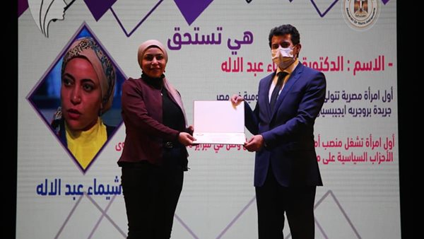 قام وزير الشباب والرياضة، أشرف صبحي، بتكريم كل من الدكتوره شيماء عبد الإله، والنائبة هادية حسني، أعضاء تنسيقية شباب الأحزاب والسياسيين علي مسرح الوزارة، ضمن مبادرة "هي تستحق" والتي أطلقتها الوزارة لتكريم السيدات المتميزات.
