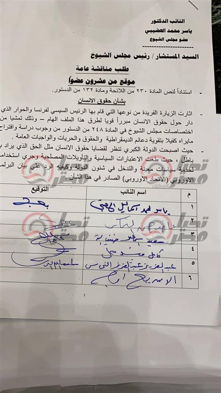 وحصلت تحيا مصر على نسخة من طلب المناقشة العامة المقدم من النائب ياسر الهضيبي وتوقيع 20 عضوا بشأن حقوق الانسان، حيث تضمن تأكيد النائب علي أن الزيارة الفريدة من نوعها التي قام بها الرئيس عبد الفتاح السيسي لفرنسا والحوار الذي دار حول حقوق الانسان مبررا قويا لطرق هذا الملف الهام، وذلك من ضمن اختصاصات مجلس الشيوخ فى المادة 248 من الدستور من وجوب دراسة واقتراح مايراه كفيلا بتقوية دعائم الديمقراطية والحقوق والحريات والواجبات العامة .