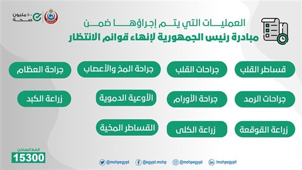 ونشرت وزارة الصحة ذلك عبر صفحتها الرسمية عبر موقع التواصل الإجتماعي "تويتر"، وكتبت:"بمبادرة رئيس الجمهورية لإنهاء قوائم الانتظار، يتم إجراء عمليات جراحية بالمجان للمواطنين الذين يحتاجون تدخل جراحي عاجل، مع الالتزام بكافة الإجراءات الاحترازية الوقائية ضد فيروس كورونا للتواصل والاستفسار يرجى الاتصال على الرقم: ١٥٣٠٠".