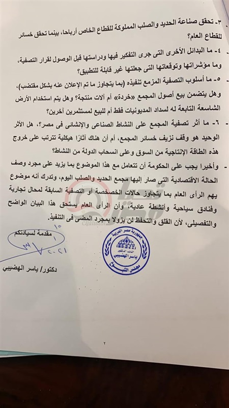 وأضاف عضو مجلس الشيوخ، ياسر الهضيبي، أن الرأى العام يستحق من الحكومة بيان توضيحي وتفصيلي عن ازمه مجمع الحديد والصلب بحلوان لأن القلق والتحفظ لن يزولا بمجرد المضي في التنفيذ مشيرا في طلب السؤال الموجه لرئيس الوزراء والذي يضمن 8 نقاط منها البدائل التي جري دراستها قبل قرار التصفية وأسلوب التصفية وأثر تصفية المجمع علي النشاط الصناعي.